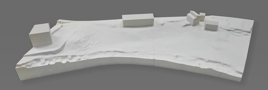 Für ein aktuelles Projekt haben wir aus einem gelieferten 3D-Mesh einer Landschaft ein vollständiges, detailgetreues Modell erstellt. Die Rohdaten wurden von uns aufbereitet, ergänzt und optimiert. unter anderem durch das einfügen der Gebäude und die Anpassung an den gewünschten Maßstab. Im Anschluss haben wir das Modell im 3D-Druck im Maßstab 1:200 realisiert. Mit einer beeindruckenden Größe von über 100 x 60 cm entstand so ein präzises und anschauliches Landschaftsmodell, das sowohl topografische Details als auch die Bebauung realistisch wiedergibt.